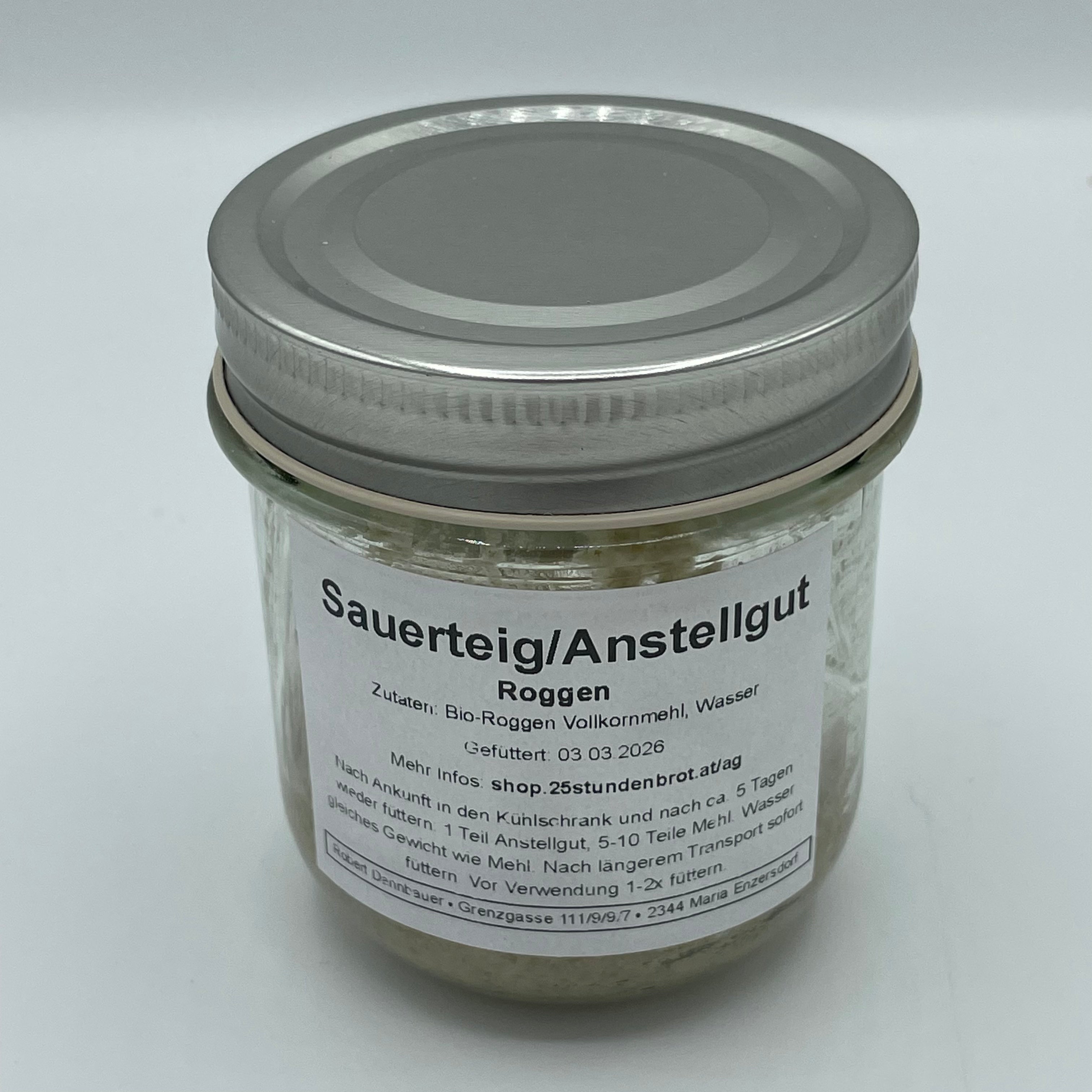 Der Sauerteig wird unmittelbar vor Versand nochmals gefüttert (flüssig - 1 Teil Mehl, 1 Teil Wasser) und kann dann weiterverwendet oder im Kühlschrank eine Woche gelagert werden.