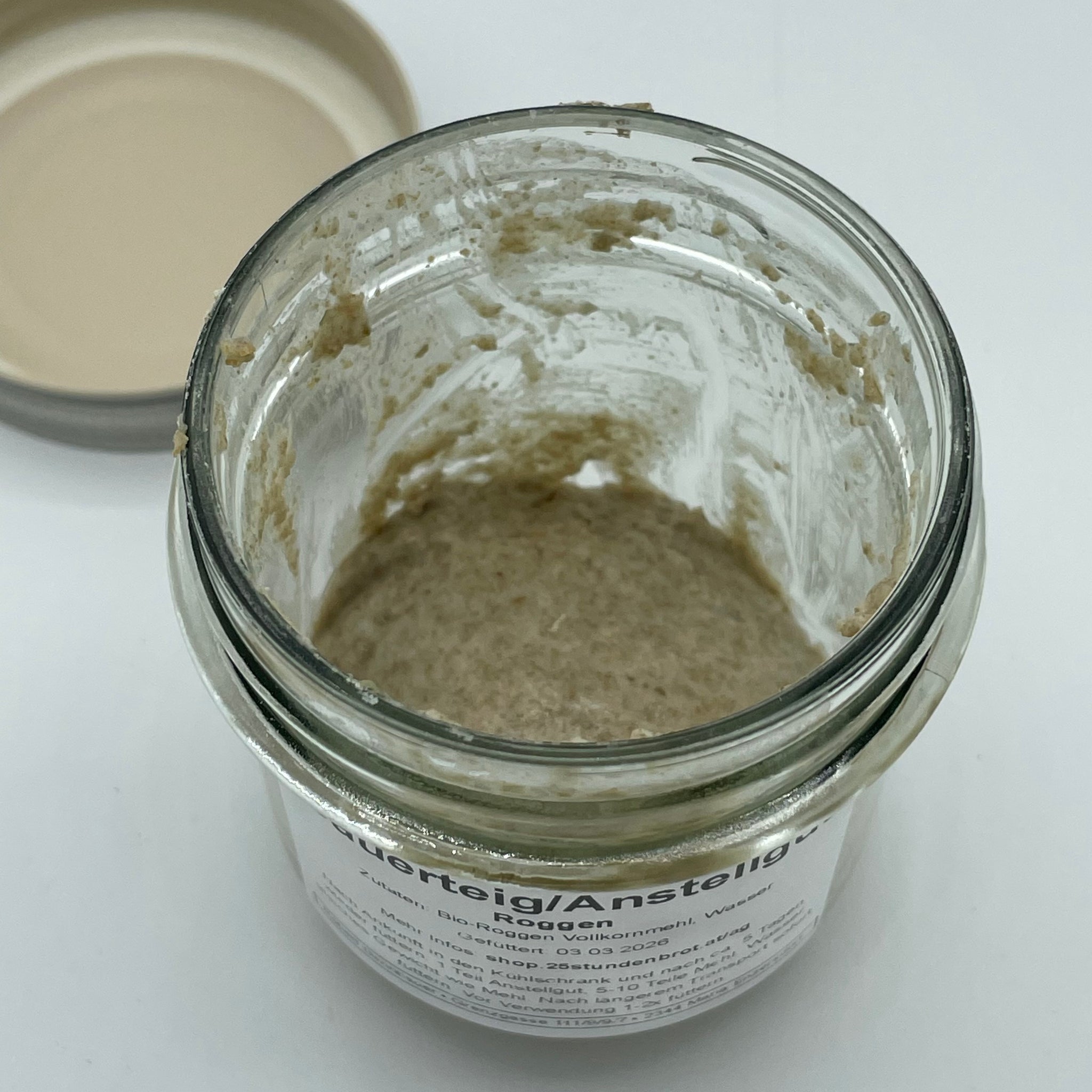 Bitte beachtet folgendes: es kann durch die Aktivität des Sauerteigs in seltenen Fällen vorkommen, dass dieser übergeht und teilweise ausläuft. Mit dem im Glas verbleibenden Rest können Sie allerdings immer weiter füttern (5 g Altsauerteig reichen da vollkommen aus). Mit der Bestellung dieses Produktes akzeptieren Sie explizit, dass wenn ein Teil des Sauerteigs ausgelaufen ist, wir keine Ersatzlieferung vornehmen.